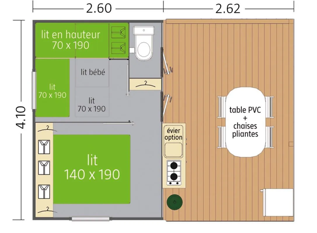 ATTENTION : Douche et évier dans les sanitaires communs. Il n’est pas possible d’ajouter une TV dans ce logement.