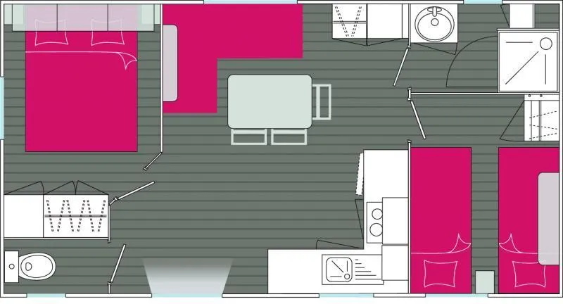 1 chambre parents avec un lit de 140×190 cm ou 160×200 ( nous contacter pour plus de précision), 1 chambre enfants avec 2 lits de 80×190 cm, oreillers et couettes dans les chambres, linge de lit non fourni, cuisine, plaque gaz, cafetière, réfrigérateur, micro-ondes, salon, douche, lavabo, wc (séparé de la partie douche), chauffage salon, terrasse surélevée semi-couverte, salon de jardin.
