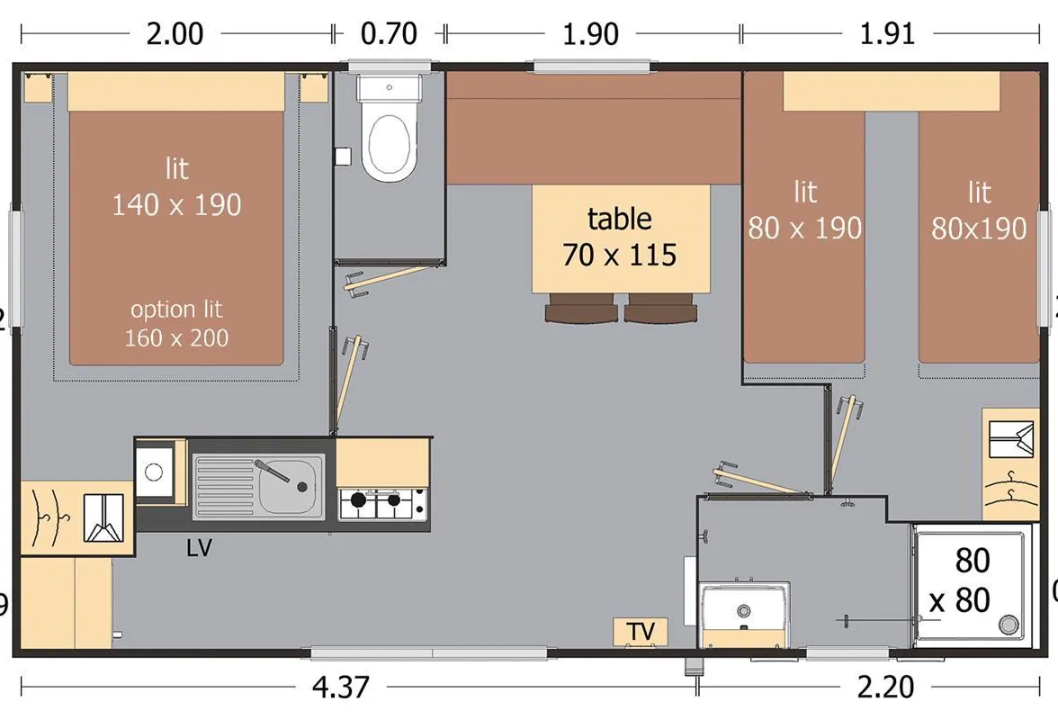1 chambre parents avec un lit de 160×200 cm, 1 chambre enfants avec 2 lits de 80×190 cm, oreillers et couettes dans les chambres, linge non fourni, cuisine, plaque gaz, cafetière, réfrigérateur, micro-ondes, salon, douche, lavabo, wc (séparé de la partie douche), chauffage salon, terrasse semi-couverte, salon de jardin.
