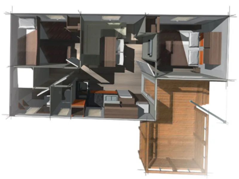 1 chambre parents avec un lit de 140×190 cm, 1 chambres enfants avec 2 lits de 80x190cm, 1 banquette convertible 1 place dans le salon, oreillers et couettes dans les chambres, linge de lit non fourni, cuisine, plaque gaz, cafetière, réfrigérateur-congélateur, micro-ondes, salon, douche, lavabo, wc (séparé de la partie douche), chauffage salon, terrasse semi-couverte en angle du mobil-home, salon de jardin.