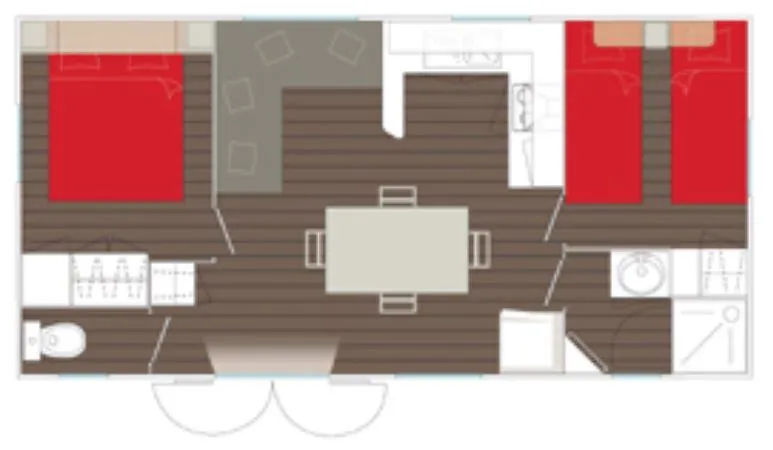 1 chambre parents avec un lit de 140×190 cm, 1 chambre enfants avec 2 lits de 80×190 cm, 1 canapé convertible 130×190 cm pour 2 personnes dans le salon (ne convient pas à des adultes), oreillers et couettes dans les chambres, linge non fourni, cuisine, plaque gaz, cafetière, réfrigérateur, micro-ondes, salon, douche, lavabo, wc (séparé de la partie douche), chauffage salon, terrasse surélevée semi-couverte, salon de jardin.
