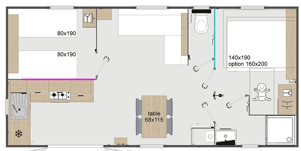 1 chambre parents avec un lit de 140×190 cm, 1 chambre enfants avec 2 lits simples et 1 lit superposé (80x190cm), 1 banquette une place dans le séjour (sauf trois emplacements de mobil-homes, nous contacter pour plus de précisions), oreillers et couettes dans les chambres, linge non fourni, cuisine, plaque gaz, cafetière, réfrigérateur-congélateur, micro-ondes, salon, douche, lavabo, wc (séparé de la partie douche), chauffage salon, terrasse surélevée semi-couverte, salon de jardin.