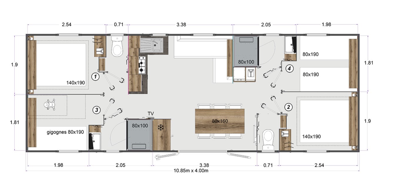 1 slaapkamer voor de ouders met een bed van 140×190 cm, 2 slaapkamers voor de kinderen met 2 bedden van 80×190 cm, een ruimte voor de kinderen (tafel en lage stoelen), kussens en dekbedden in de slaapkamers, beddengoed niet inbegrepen, keuken, gasfornuis, koffiezetapparaat, koelkast met vriesvak, magnetron, zitkamer, douche, wastafel, WC (gescheiden van de doucheruimte), haardroger, verwarming in zitkamer en badkamers, halfoverdekt verhoogd terras, tuinmeubilair, veiligheidshek, babykit (kinderbed+bad+stoel) beschikbaar (alleen op schriftelijk verzoek per e-mail).