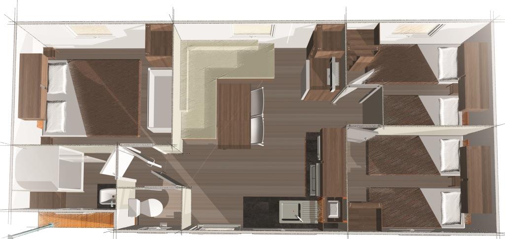1 oudersslaapkamer met bed van 140×190 cm, 1 kinderslaapkamer met 2 bedden van 80×190 cm, 1 kinderslaapkamer met 2 bedden van 80×190 cm en een stapelbed van 70×190 cm (voor een kind van 5 tot maximaal 10 jaar), kussens en dekbedden in de slaapkamers, beddengoed niet inbegrepen, keuken, gasfornuis, koffiezetapparaat, koel-vriescombinatie, vaatwasser, magnetron, zithoek, douche, wastafel, wc (apart van de doucheruimte), verwarming in de zithoek, verhoogd halfoverdekt terras, tuinmeubilair.