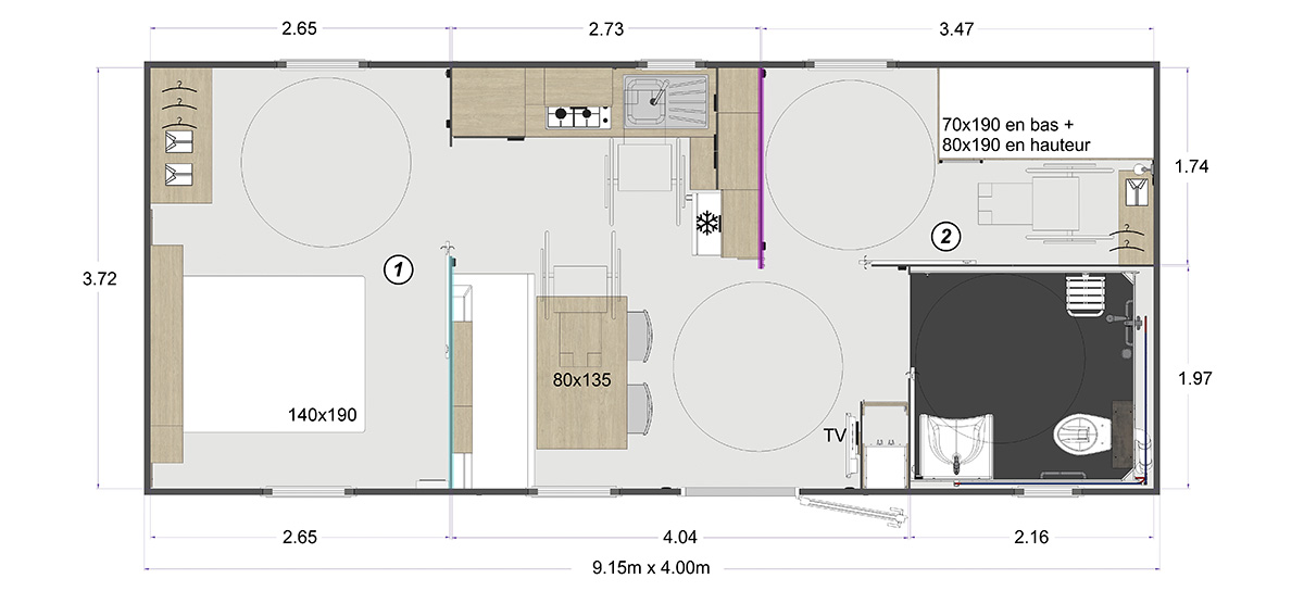 1 oudersslaapkamer met een bed van 140×190 cm, 1 kinderslaapkamer met een hoog bed van 80×190 cm (ladder) en een vrijstaand bed van 70×190 cm, kussens en dekbedden in de slaapkamers, beddengoed niet inbegrepen, keuken, gasfornuis, koffiezetapparaat, koel-vriescombinatie, magnetron, vaatwasser, salon, douche, wastafel, toilet (NIET apart van de doucheruimte), verwarming in de salon, halfoverdekt verhoogd terras, tuinmeubels. Accommodatie geschikt voor mensen met beperkte mobiliteit.